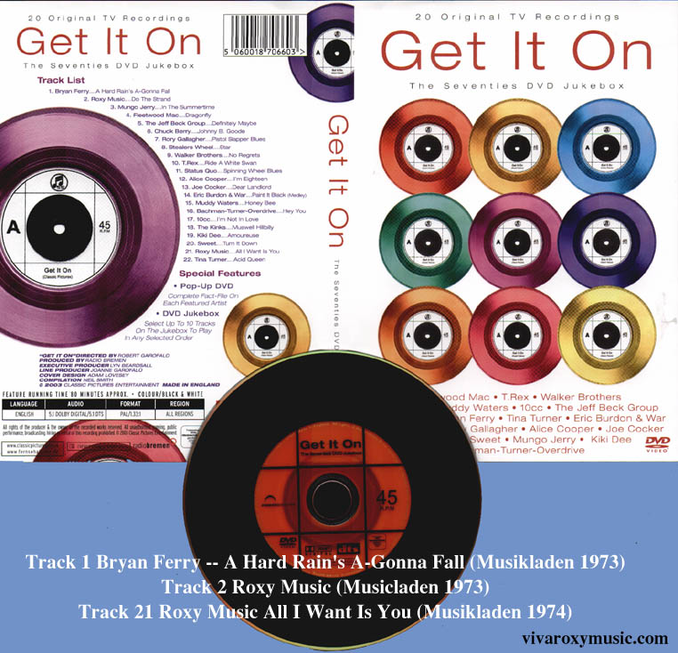 This disc features the only commercially available footage of Bryan Ferry's performance of 'A Hard Rain's A-Gonna Fall' from Musikladen from 1973. Also included is the footage of Roxy Music 'Do The Strand' & 'All I Want Is You' from 1973& 1974 on the German TV show Musikladen. This footage is available on several DVD issues.